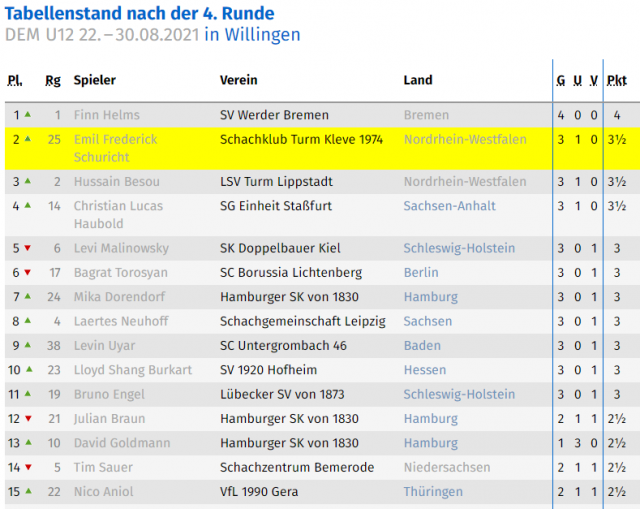 Egal wie das Turnier weiter verläuft. Emil zeigt, dass er für die stärksten Spieler seiner Altersklasse in Deutschland, ein gefährlicher Gegner ist. Wie die Tabelle am Ende aussieht, werden wir am Sonntag sehen. Aber auch das Zwischenergebnis darf man genießen. Einen Spieler von uns mit unserem Vereinsnamen in einer Deutschen Meisterschaft so weit oben zu sehen, dass kommt nicht so regelmäßig vor.
