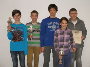 Marc erspielte 3 von möglichen 7 Punkten und belegte damit Platz 11. Dennis wurde Zehnter mit 3 Punkten und etwas besserer Wertung als Marc. Kevin konnte mit 6 Punkten seinen zweiten Platz aus dem Vorjahr verteidigen und sich damit für die NRW Meisterschaft qualifizieren. Den dritten Platz in der Altersgruppe belegte Benjamin mit 5 Punkten. Elyse durfte durch einen Freiplatz in der U16w starten. Dort spielten sechs Mädchen im Rundensystem gegeneinander. Sie spielte ein sensationelles Turnier und belegte am Ende den zweiten Platz der zur Teilnahme an der NRW Meisterschaft berechtigt.