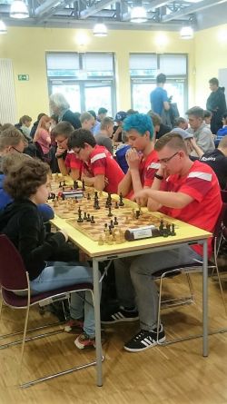Das Ende der Saison war am 02.07.2017 die NRW-Blitzmannschaftsmeisterschaft. Dort sind wir mit Kevin Verfürth, Benjamin Melde, Justus Wiegersma und Dennis Hoenselaar angereist. Es war meine (Dennis A.‘s) Hoffnung, unter die Top 10 zu kommen. Da ich aber von Anfang an gesagt habe, dass wir dorthin fahren um Spaß zu haben und am Ende schauen, was wir erreicht haben, habe ich dieses Ziel nicht an die Jugendlichen weitergegeben. In den ersten 3 Runden bekam mein Plan Risse, denn die Jungs verloren und spielten auch nicht gerade gut. Aber dann wendete sich das Blatt und sie gewannen Spiel für Spiel. Somit standen sie zwischenzeitlich sogar auf Platz 3 der Tabelle. Am Ende belegten wir den 8. Platz. Ziel erreicht! Erster wurde Porz mit einem DWZ-Schnitt von 2175. Kevin spielte 2-mal gegen FIDE-Meister und holte daraus 1½ Punkte. Benjamin spielte auch gegen einen FM und holte auch einen halben Punkt. Das ganze Team hatte seine lichten wie auch dunklen Momente über das Turnier hinweg.