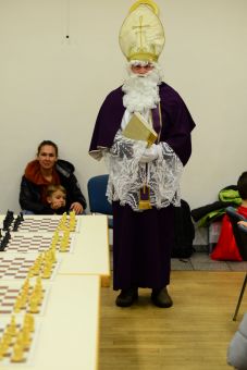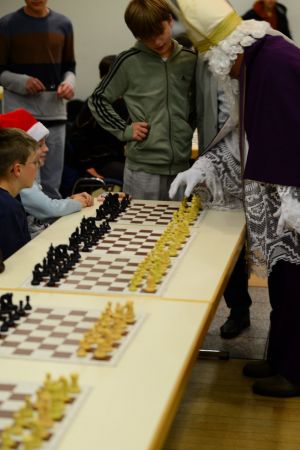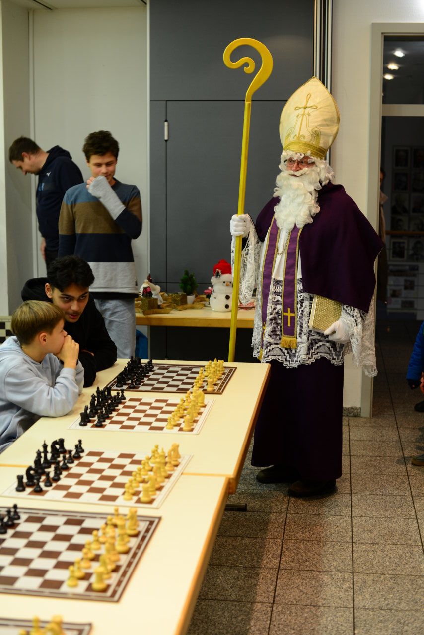 Dann erschien der Nikolaus, der das Turnier einleitete. Mit ein paar warmen Worten schaffte er eine angenehme Stimmung, die besonders den jüngeren Teilnehmenden ein Lächeln ins Gesicht zauberte. Anschließend trat er an eines der Bretter, führte den ersten Zug aus. Damit begann das Nikolausturnier offiziell.