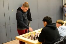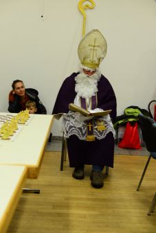 Dann erschien der Nikolaus, der das Turnier einleitete. Mit ein paar warmen Worten schaffte er eine angenehme Stimmung, die besonders den jüngeren Teilnehmenden ein Lächeln ins Gesicht zauberte. Anschließend trat er an eines der Bretter, führte den ersten Zug aus. Damit begann das Nikolausturnier offiziell.